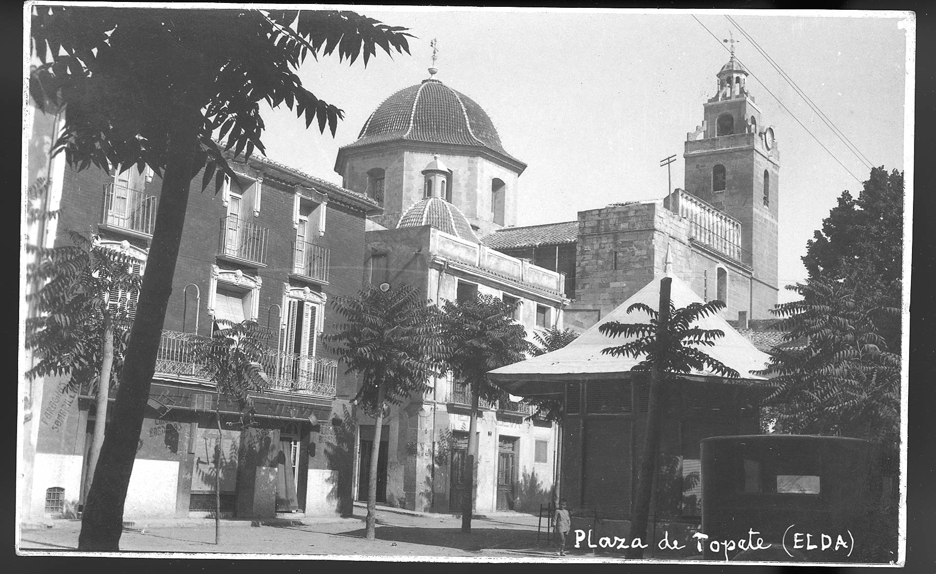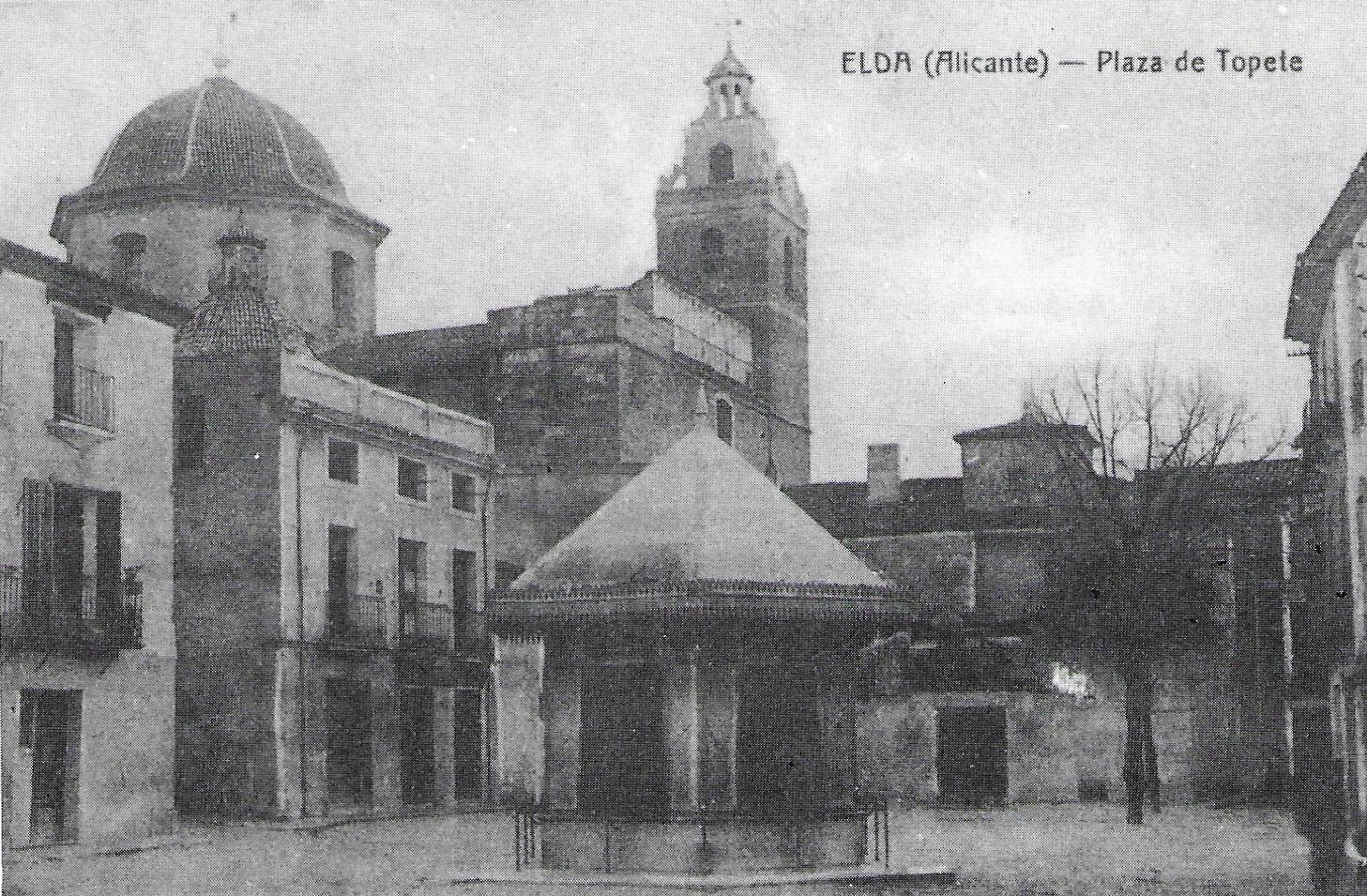 Su uso como una de las plazas de la villa de Elda no está claro, al menos, hasta la Edad Moderna, si bien la plaza de Arriba pudo ir conformándose como espacio público ya a finales de la Edad Media. Desde sus orígenes, la plaza estuvo comunicada con el castillo de Elda y palacio condal de los Coloma a través de la calle del Castillo o calle Empedrada. A lo largo del siglo XVII, tras la expulsión de los moriscos, esta plaza forma parte claramente de la trama urbana de la villa junto con la plaza del Ángel o plaza de Abajo. En el entorno de la plaza de Arriba se ubicaría el cementerio de los cristianos nuevos, el fosar de afuera, en el eje de entrada y salida de Elda por el portal de las Eras, así como algunas de las más señaladas calles (Comisario o Linares, Toril) y plazuelas de la antigua villa, como las de San Pascual y de la Iglesia.