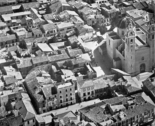 Todavía se conserva en la plaza el panel cerámico devocional del Santísimo Cristo del Vall, fechado a inicios del siglo XIX. Una plaza que, durante siglos, dispuso de fuente pública y fue un lugar dedicado al mercado diario, compartiendo ocasionalmente con la plaza de Abajo el mercado semanal (1426) y la feria anual (1466). Varias fotografías de inicios del siglo XX muestran el antiguo y llamativo puesto del pescado en la plaza.