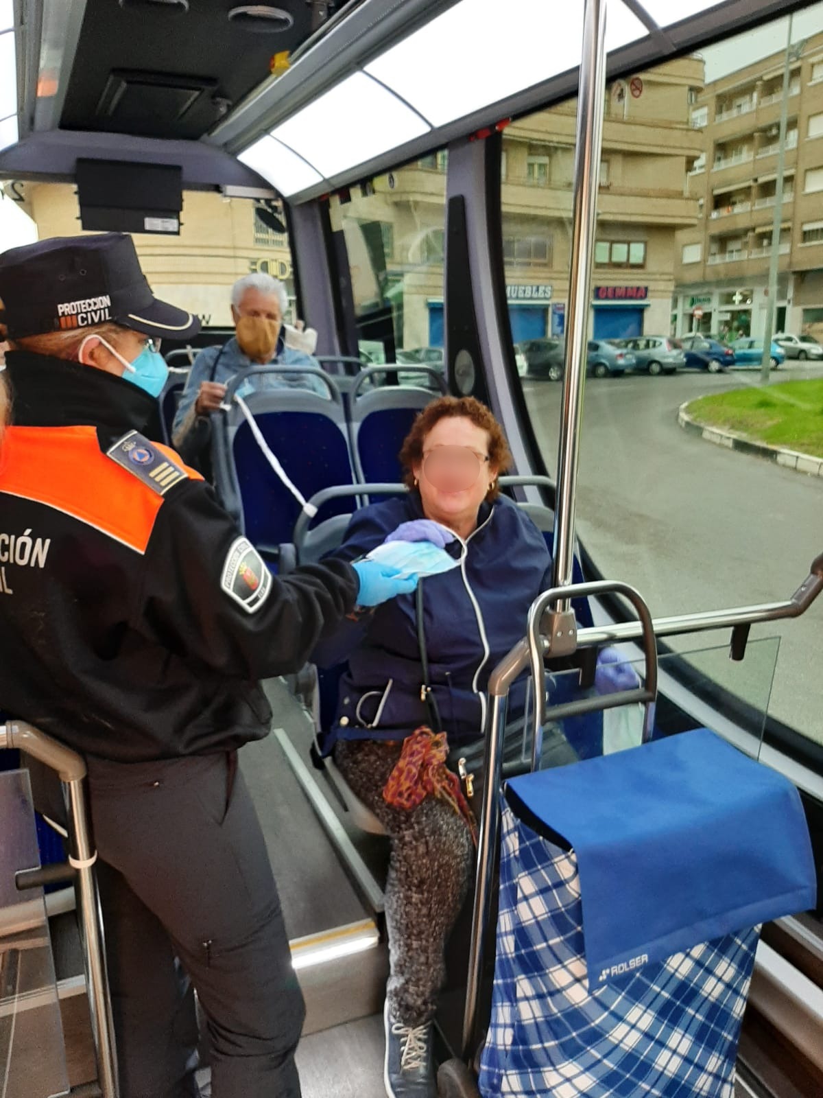 Efectivos de la Policía Local de Elda y de la agrupación local de Protección Civil han comenzado esta mañana el reparto de mascarillas entre los usuarios del transporte público. Las mascarillas forman parte del lote preparado por el Gobierno de España para su distribución entre los trabajadores y trabajadoras que utilizan los medios de transporte público para acudir a sus centros de trabajo. El material ha sido distribuido entre las 7 y las 9 de la mañana en las paradas del autobús de la Plaza de la Ficía, Hospital de Elda y la Rotonda de Moros y Cristianos. La distribución continuará mañana martes también entre los usuarios del transporte público.