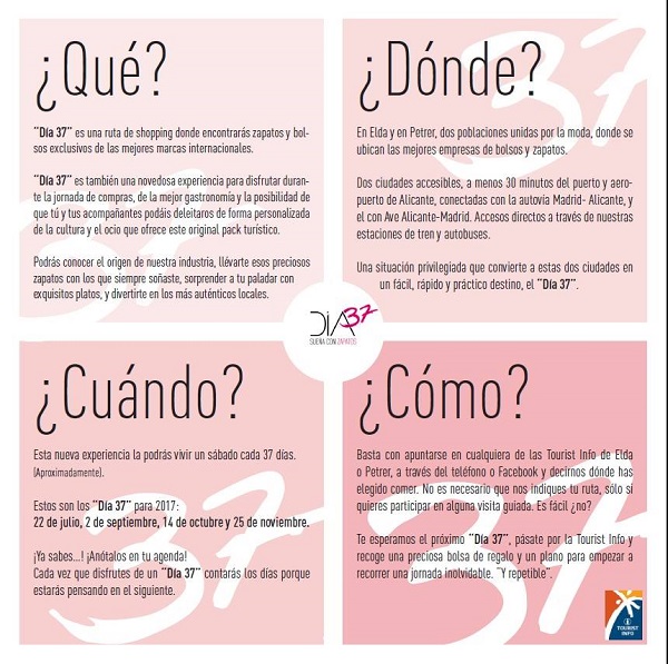 A partir de la semana próxima, se van a repartir 10.000 folletos del “Día 37, sueña con zapatos” por todas las Oficinas de Turismo de la costa alicantina. Las interesadas en participar en esta ruta shopping tienen que inscribirse a través de las Tourist Info de Petrer o Elda, ya sea en la propia oficina, por teléfono (Petrer: 966 98 03 00; Elda: 96 698 04 01) o por Facebook.