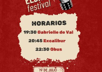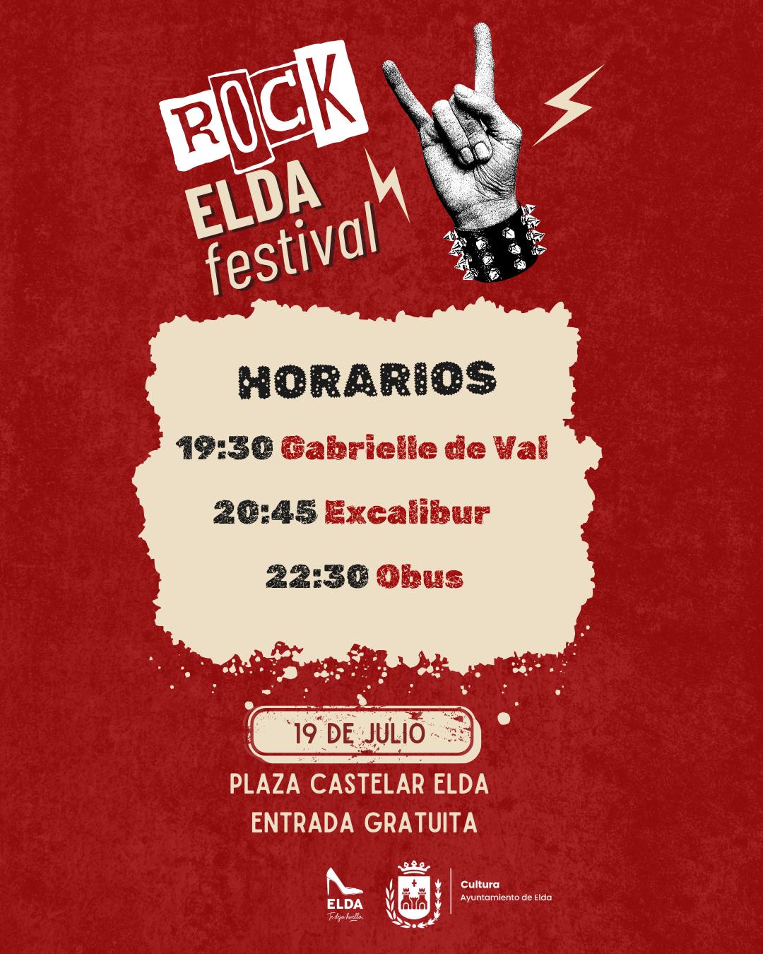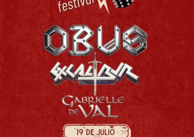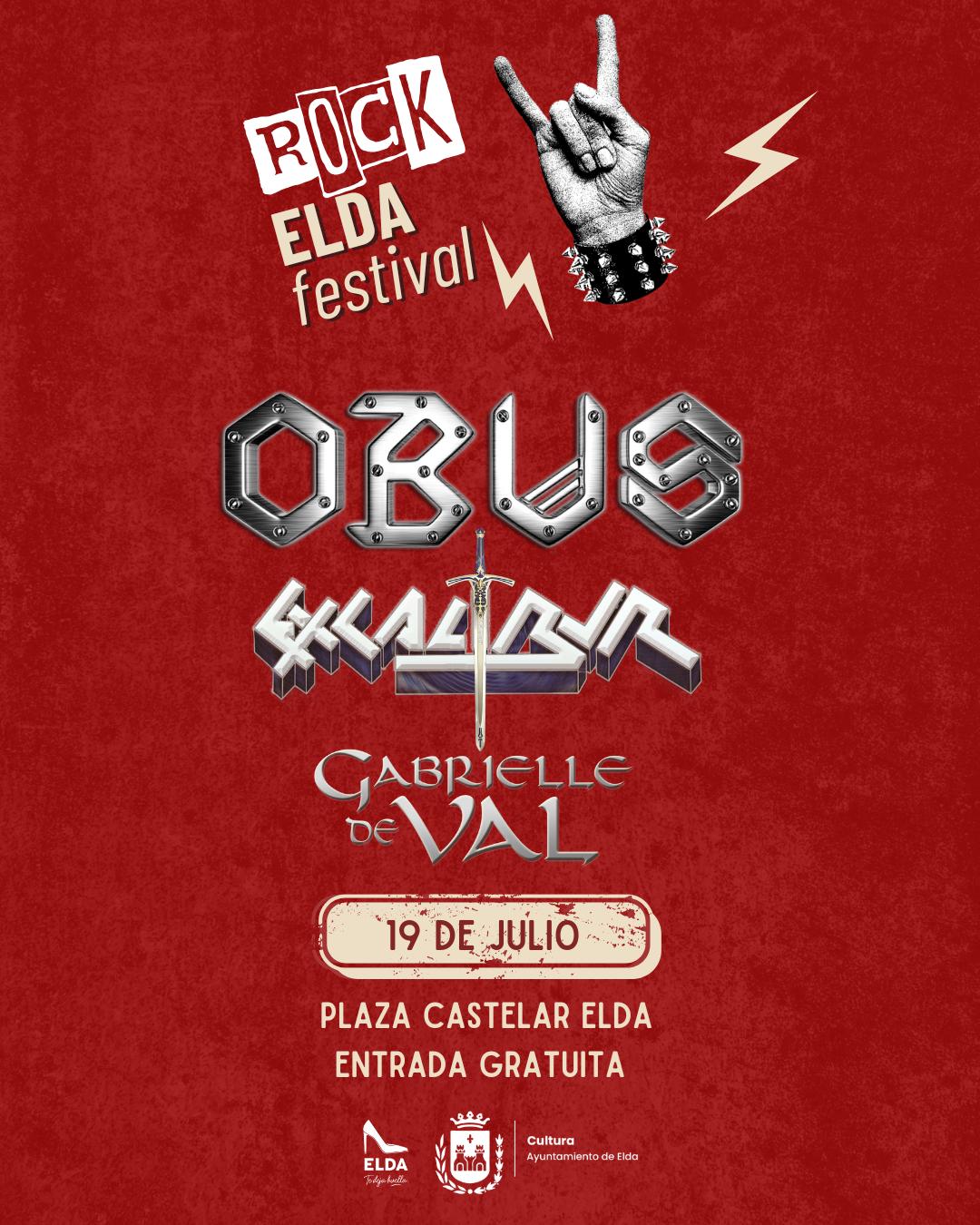 El cartel lo encabeza la mítica banda Obús, una de las formaciones más emblemáticas del heavy metal español, que actuará a las 22:30 horas. Previamente, a las 20:45 horas, los eldenses Excalibur, que este año celebran su 40 aniversario, harán rugir sus guitarras en casa y la jornada dará comienzo a las 19:30 horas con la actuación de Gabrielle de Val, una de las voces más reconocidas del rock melódico nacional.
