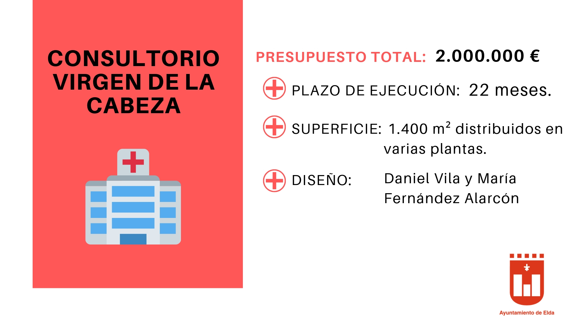 Se trata del paso previo al inicio de los trabajos que cuentan con un presupuesto total de 2.000.000 de euros y tienen un plazo de ejecución de 22 meses. Este nuevo consultorio auxiliar se emplazará en la parcela cedida en suelo urbano por el Ayuntamiento de Elda, ubicada en la manzana comprendida entre las calles Virgen de la Cabeza, Salmerón, Las Navas y Sagunto.
