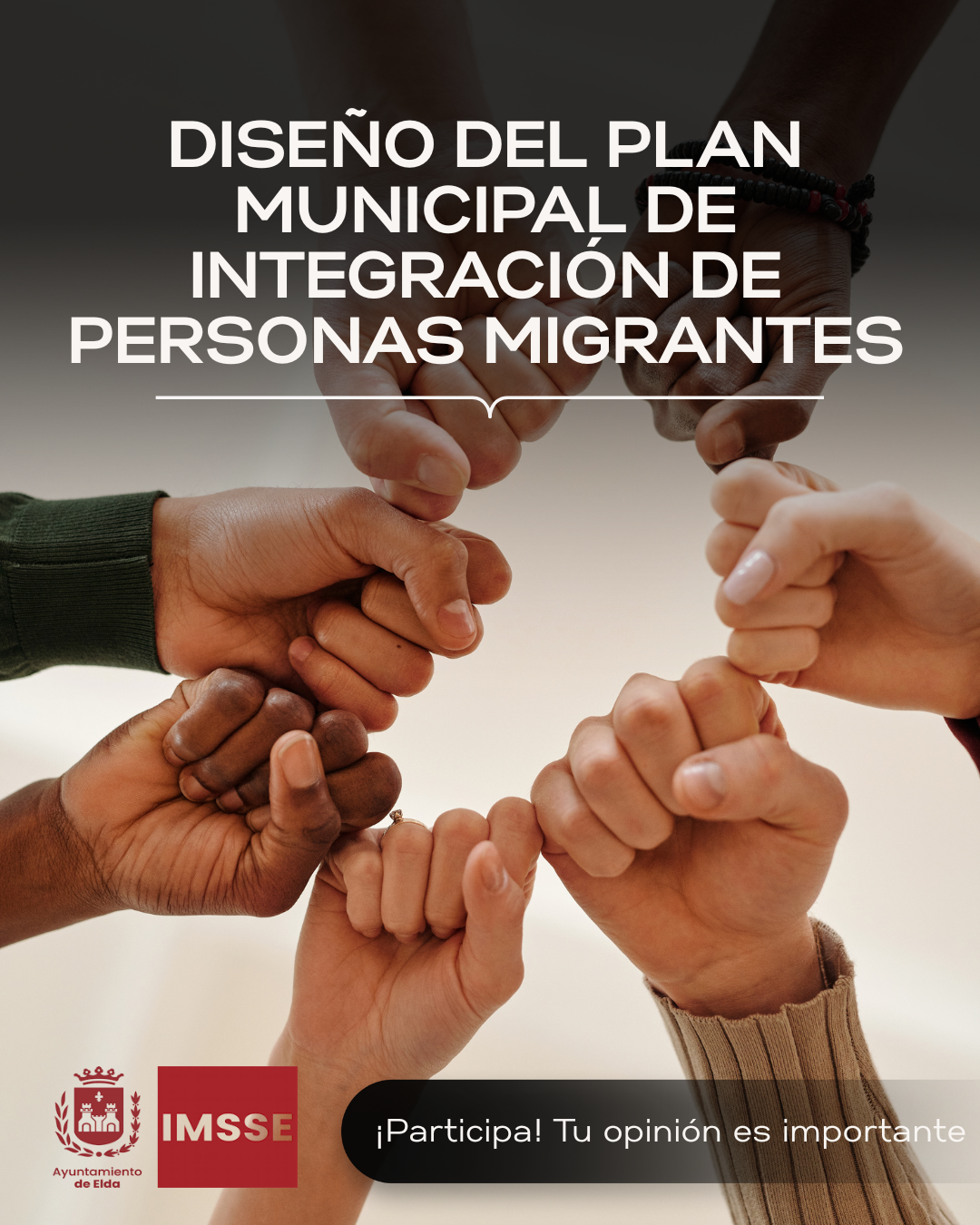 El Instituto Municipal de Servicios Sociales de Elda está diseñando el I PLAN MUNIPAL DE INTEGRACIÓN DE PERSONAS MIGRANTES y queremos conocer tu opinión. JUNTOS/AS HACEMOS UNA CIUDAD MÁS ACOGEDORA, DIVERSA Y UNIDA. PARTICIPA.
