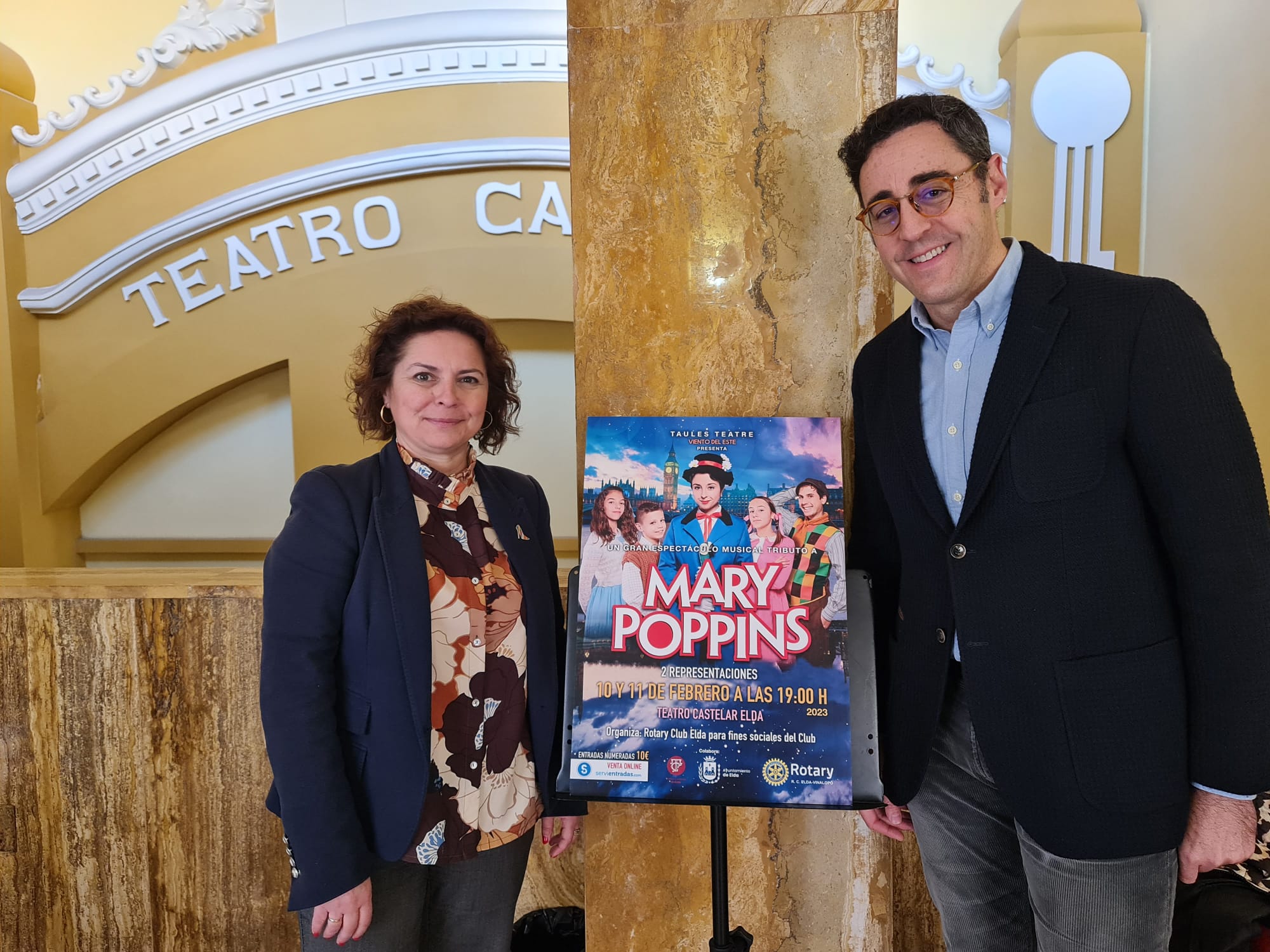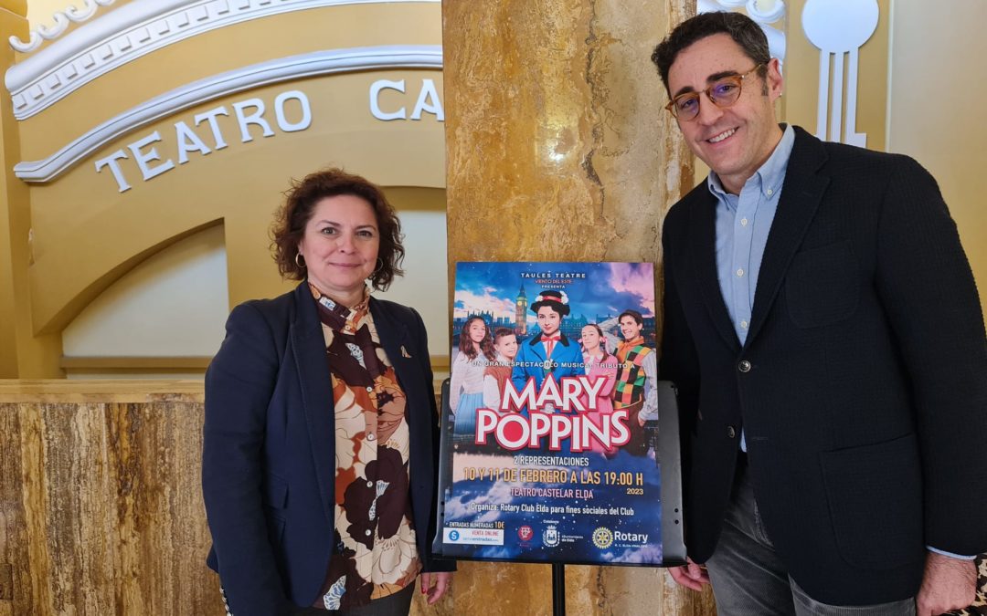 La concejala de Teatro, Rosa Vidal, y el presidente del Rotary Club Elda, Alejandro Pérez, han presentado esta mañana la obra ‘Vientos del Este’, una adaptación que rinde tributo a ‘Mary Poppins’ y que la compañía Taules Teatre llevará al escenario del Teatro Castelar los días 10 y 11 de febrero, a partir de las 19.00 horas. La doble representación tiene carácter benéfico y la recaudación se destinará a las ONG y colectivos a los que ayuda el Rotary Club Elda.