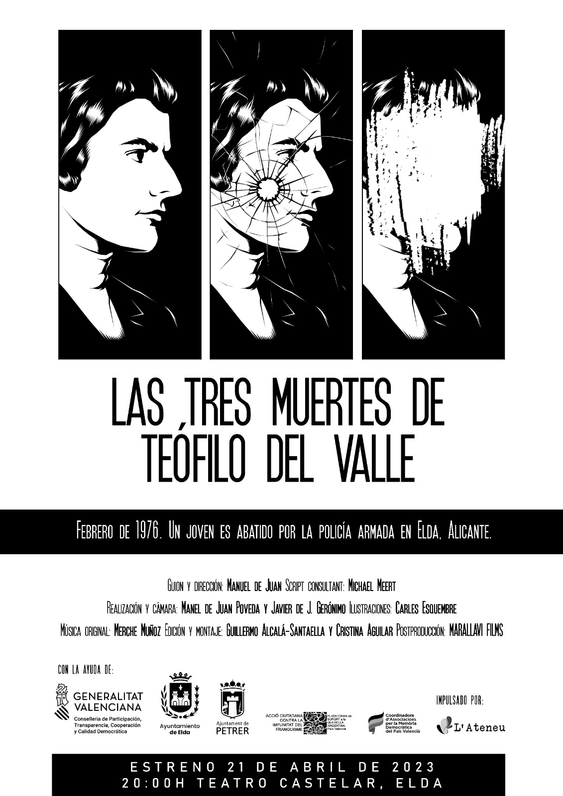 El Teatro Castelar acogerá el próximo viernes, 21 de abril, la presentación del documental ‘Las tres muertes de Teófilo del Valle’, una obra dirigida por Manuel de Juan y que recoge la historia del joven oficinista eldense fallecido durante una huelga del calzado en febrero de 1976. Teófilo del Valle, que tenía 20 años cuando murió por disparos de la Policía Armada, es considerado primera víctima de la Transición.
