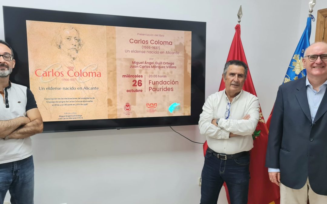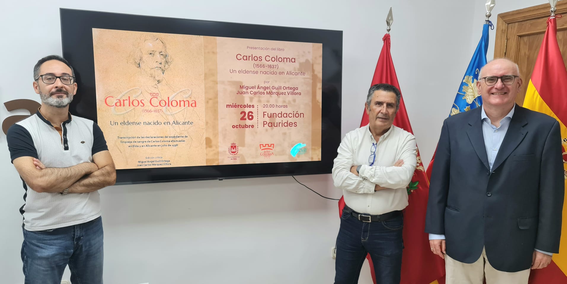 El concejal de Cultura, Amado Navalón, ha anunciado esta mañana la presentación del libro ‘Carlos Coloma. Un eldense nacido en Alicante’ , una nueva obra sobre la familia Coloma, escrita por Miguel Ángel Guill y Juan Carlos Márquez y que revela importantes novedades sobre una de sus figuras más importantes: Carlos Coloma. El edil ha estado acompañado por el presidente de la Fundación Paurides, Emilio Maestre, y el arqueólogo municipal y coautor del libro, Juan Carlos Márquez.