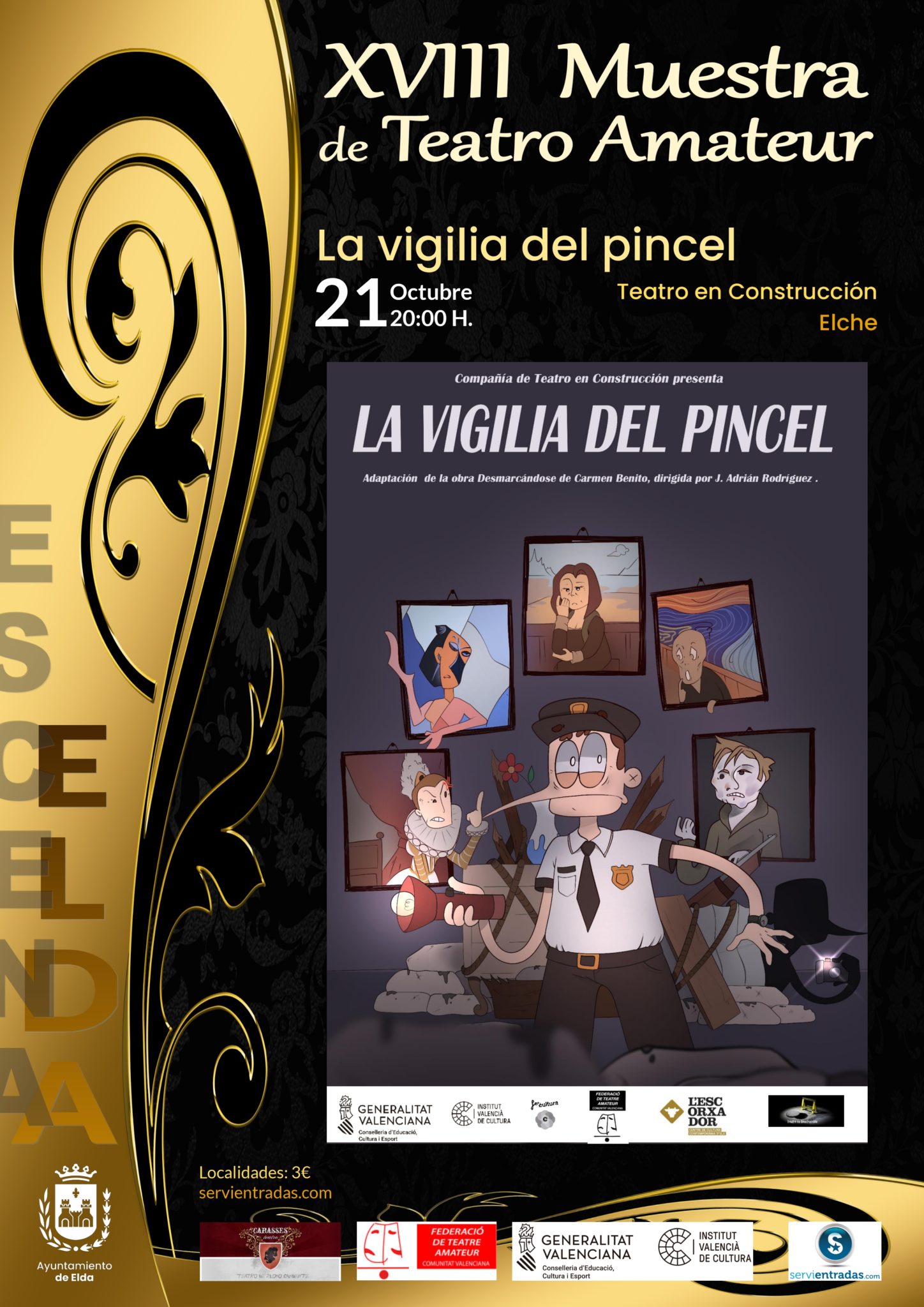21 de octubre, ‘La vigilia del pincel’, de la compañía Teatro en Construcción (Elche). Se trata de una comedia, con algunos tintes dramáticos, en la que, además de la propia palabra teatral, se entremezclan otras disciplinas artísticas como la música o la danza.
