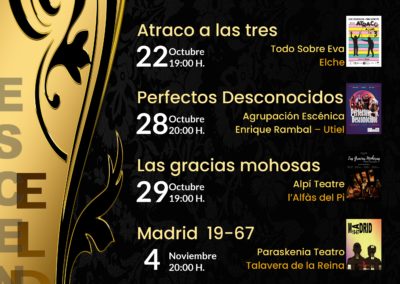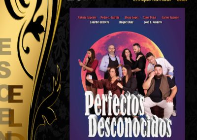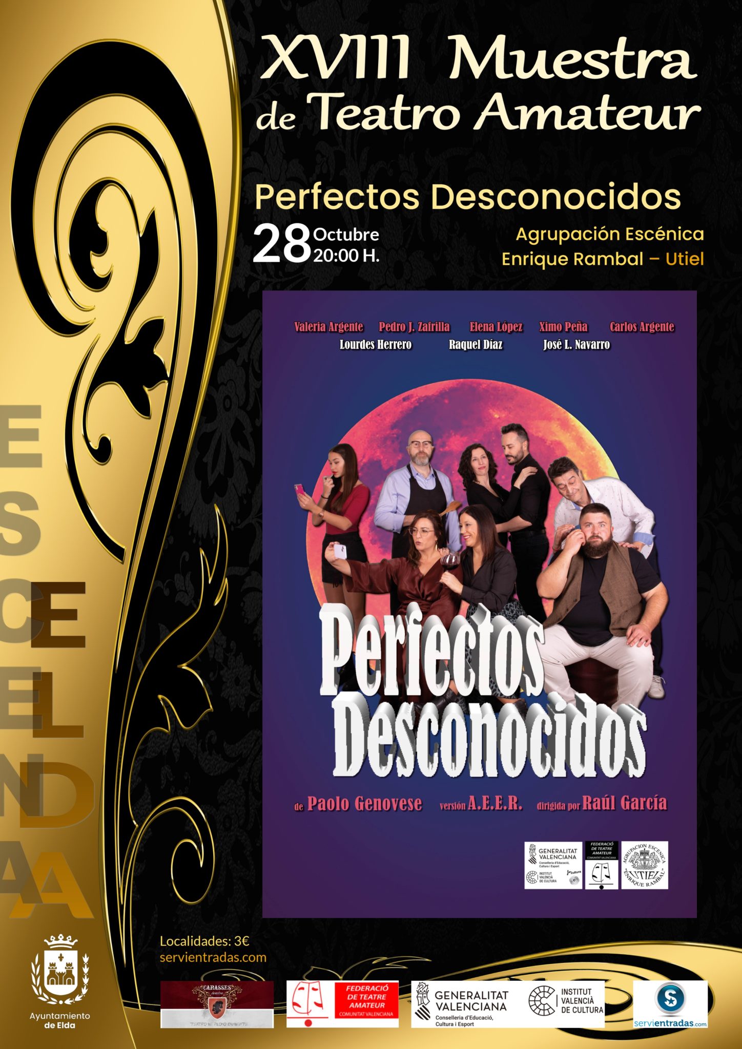 28 de octubre, ‘Perfectos desconocidos‘, de la Agrupación Escénica Enrique Rambal (Utiel). Una cena casual entre amigos acaba convirtiéndose en una exposición de todos los males que azotan a nuestra sociedad: homofobia, xenofobia, infidelidades o dependencia a la tecnología.