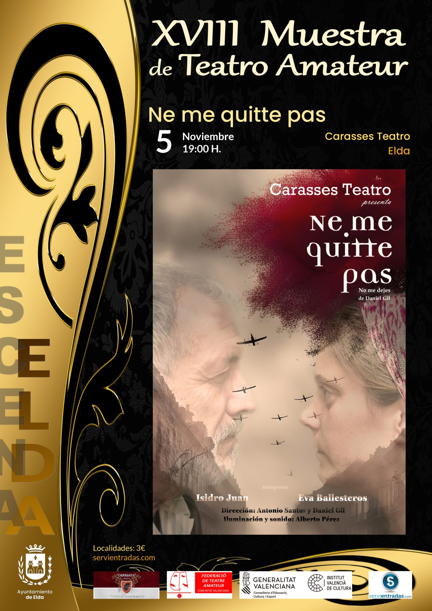5 de noviembre, Gala de clausura y estreno de ‘Ne me quitte pas’, de Carasses Teatro. Este nuevo montaje se adentra de lleno en la complicada geografía de la naturaleza humana. El autor del texto es Daniel Gil y lo interpretan Eva Ballesteros e Isidro Juan.