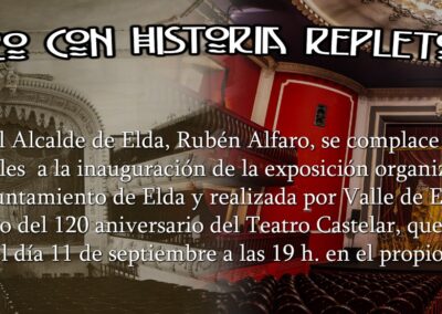 El Ayuntamiento de Elda ha organizado una interesante exposición con motivo del 120 aniversario del Teatro Castelar y de los 25 años de su reapertura, efemérides que se celebran a lo largo del presente año. La muestra, realizada por Valle de Elda, será inaugurada mañana miércoles a partir de las 19.00 horas en el vestíbulo del Teatro.