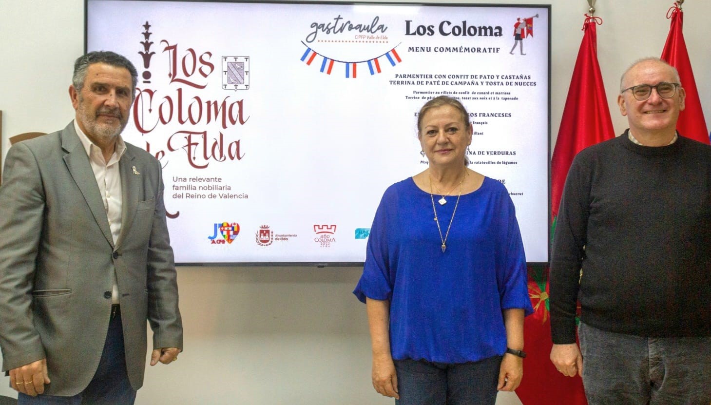 El concejal de Cultura y de Patrimonio Histórico, Amado Navalón, ha presentado esta mañana una nueva actividad enmarcada en la celebración del Año Coloma. Se trata de una jornada gastronómica inspirada en los platos que se elaboraban en la época de la noble familia eldense. Navalón ha estado acompañado en la comparecencia por Pepi Jover, presidenta de la Asociación Francófona de Elda, y por el presidente de la Fundación Paurides, Emilio Maestre.