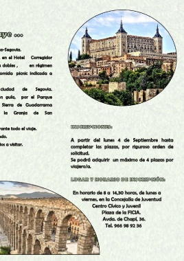 Regreso a Segovia y cena libre. ‐Documentación de los sitios a visitar. completar las plazas, por riguroso orden de